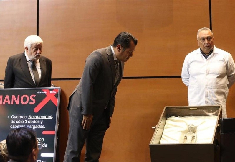 "Son seres no humanos que no son parte de nuestra evolución terrestre. De acuerdo a la Universidad Nacional Autónoma de México, quien realizó los análisis de carbono 14, estos seres tienen alrededor de mil años de antigüedad, es decir, no se trata de seres que fueron recuperados en naves, sino que son seres que estaban sepultados en minas de diatomea", explicó Maussan.