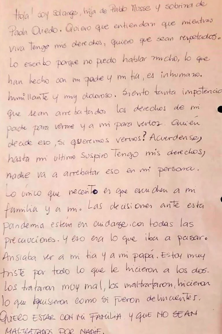 Hola, soy Solange Musse, hija de Pablo Musse y sobrina de Paola Oviedo. Quiero que entiendan que mientras viva tengo mis derechos, quiero que sean respetados. Lo escribo porque no puedo hablar mucho, lo que han hecho con mi padre y mi tía es inhumano, humillante y muy doloroso. Siento tanta impotencia de que sean arrebatados los derechos de mi padre para verme y a mí para verlo. Quién decide eso si queremos vernos? Acuérdense, hasta mi último suspiro tengo mis derechos, nadie va a arrebatar eso en mi persona. Lo único que necesito es que escuchen a mi familia y a mí. Las decisiones ante esta pandemia están en cuidarse, con todas las precauciones, y eso es lo que iba a pasar. Ansiaba ver a mi tía y a mi papá. Estoy muy triste por todo lo que le hicieron a los dos, los trataron muy mal, los maltrataron, hicieron lo que quisieron como si fueran delincuentes. QUIERO ESTAR CON MI FAMILIA Y QUE NO SEAN MALTRATADOS POR NADIE. Espero que esto que le ha pasado a mi familia no le suceda a más nadie. Hasta dónde llegan nuestros derechos? Quiero que se sepa todo esto por el dolor de la familia, no quiero que más nadie sufra por estas situaciones. Ni mi familia, ni ningún ser humano que está pasando por esta situación porque estoy segura que no soy la única. Amo a mi familia y nadie va a hacer lo que quiera con ellos. Quiero que quede bien claro todo esto. Gracias por difundirlo. Solange.