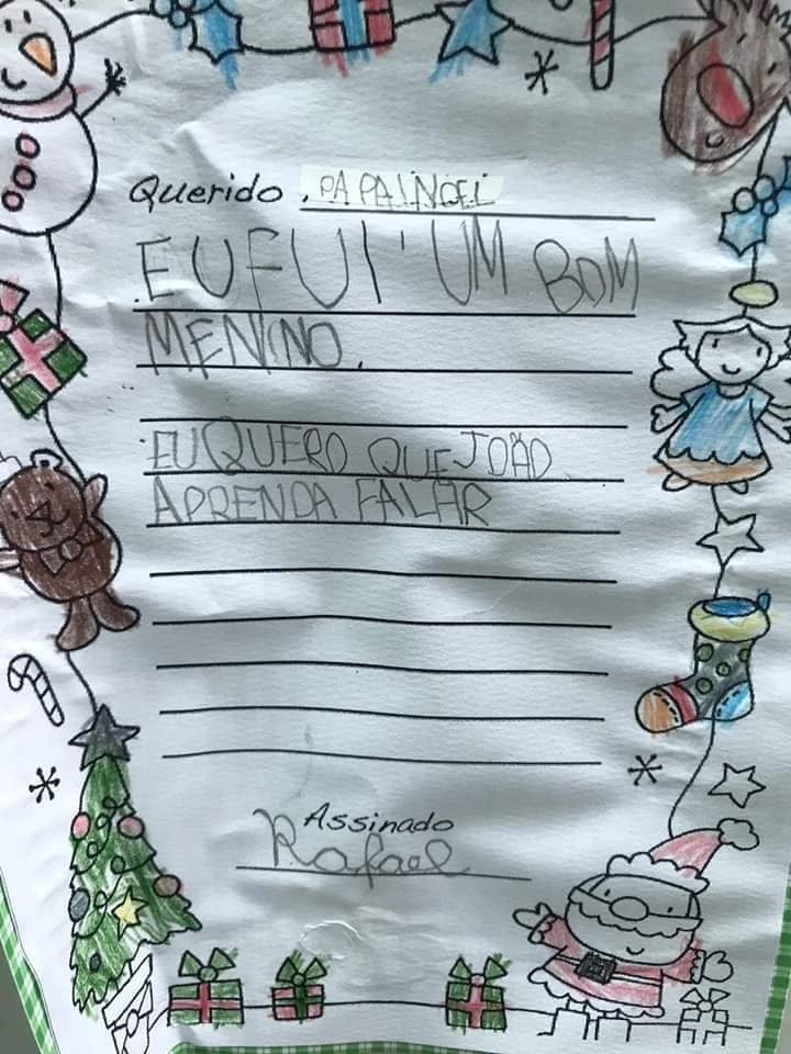 “Este es el regalo de Navidad que pidió mi hijo Rafael: le pidió a Papa Noel que su amigo João tenga la capacidad de hablar. João también tiene autismo, pero es mudo. Comparto esto para demostrar que las personas con autismo también aman, tienen amigos, sentimientos y deseos. Aunque no pueda hablar con él, Rafa entiende todo lo que João quiere expresar porque se comunica con su mirada y Rafa lo entiende con el corazón”, escribió Carina, la madre.