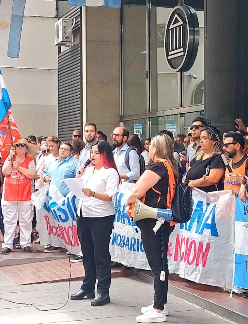 La secretaria general de La Bancaria Rosario, Analía Ratner, habló en el acto realizado frente al banco y se desplegaron banderas con las consignas “el banco no se vende” o “la Patria no se vende”.