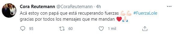 “Acá estoy con papá que está recuperando fuerzas. #FuerzaLole gracias por todos los mensajes que me mandan”, publicó.