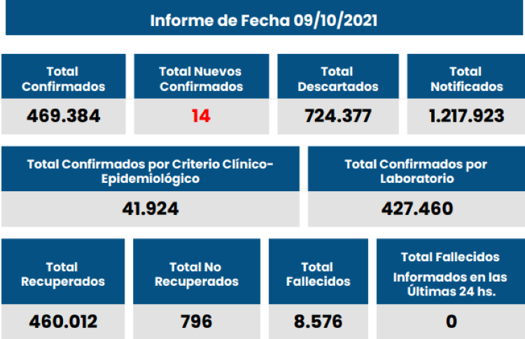 Con esos datos, la cantidad de positivos desde el inicio de la pandemia llegó a 469.384 mientras que 796 se mantienen como activos (no recuperados).