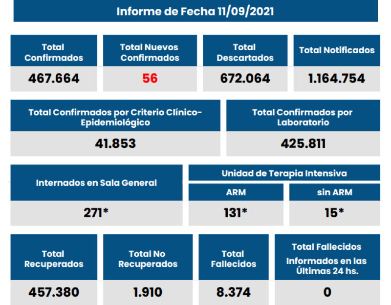 El total de casos activos es 1.910 y de ellos están internados 271 pacientes en sala general mientras que permanecen en terapia intensiva 146.
