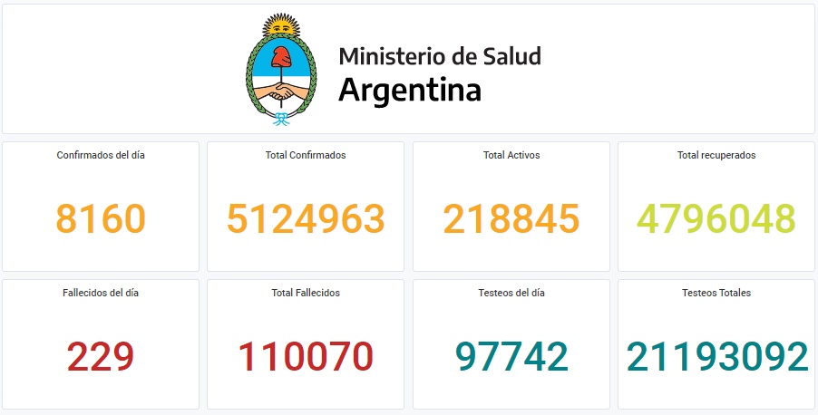 Argentina reportó este viernes otros 229 fallecidos y 8.160 casos positivos de coronavirus, informó el Ministerio de Salud de la Nación.