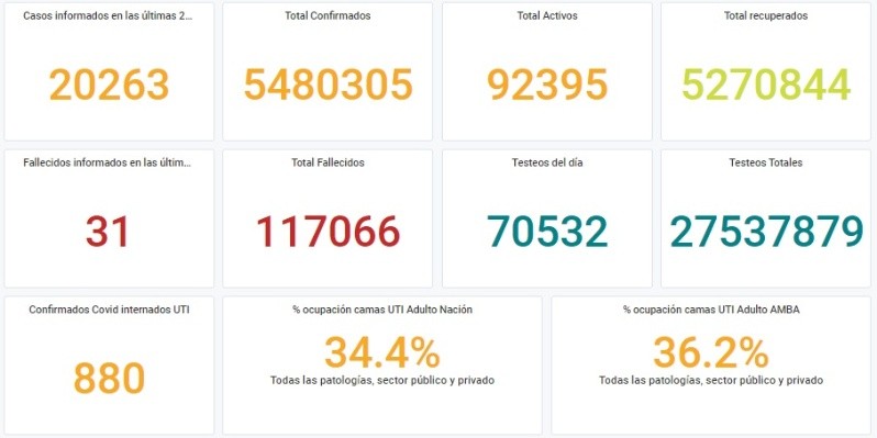 Otras 31 personas murieron y 20.263 fueron reportadas con coronavirus en las últimas 24 horas en la Argentina, informó este lunes el Ministerio de Salud de la Nación.