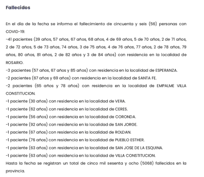 De acuerdo al reporte epidemiológico del Ministerio de Salud de Santa Fe, en todo el territorio provincial se registraron 56 fallecidos por la enfermedad.