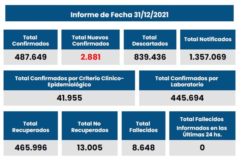 Con la cifra del último día del año, la provincia ya suma 487.649 positivos desde el inicio de la pandemia con 13.005 activos a la fecha.