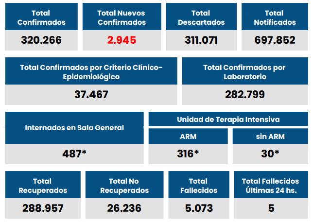 La cifra en la provincia de Santa Fe también fue elevada: 2.945 infectados que elevan el total desde el inicio de la pandemia a 320.266 (en la ciudad son 116.669).