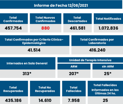 A nivel provincial, la cifra total de casos confirmados desde el inicio del brote es de 457.754 y las muertes 7.958. Además, el reporte epidemiológico notificó que actualmente son 14.610 las personas que se encuentran transitando la enfermedad de las cuáles 232 lo están haciendo en unidades de cuidados intensivos y 313 en sala general.