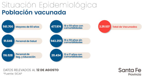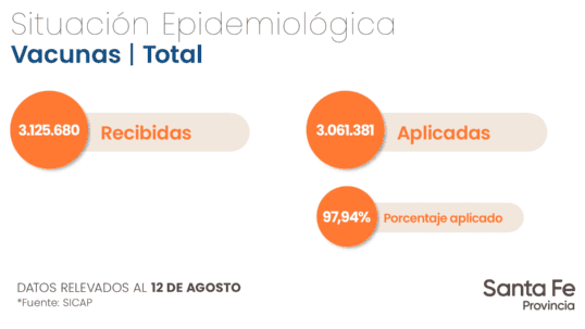 Con respecto a la campaña de vacunación, la provincia informó que en las últimas 24 horas se aplicaron 39.215 dosis y ya hay 2.211.537 santafesinos que iniciaron el proceso de inoculación de los 2.576.292 que se inscribieron en el registro voluntario. Además, 870.278 personas, ya completaron el esquema de vacunación.