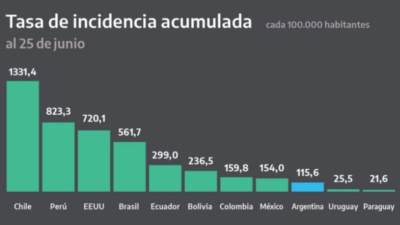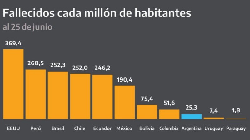 Algo similar planteó el presidente Alberto Fernández: "Piensen que Brasil hoy tiene cerca de 50 mil muertos y tiene 5 veces la cantidad de habitantes que tiene Argentina. Si Argentina hubiera seguido el ritmo de Brasil hoy tendría 10 mil muertos. Dense cuenta que el esfuerzo que hemos hecho ha tenido mucho sentido".