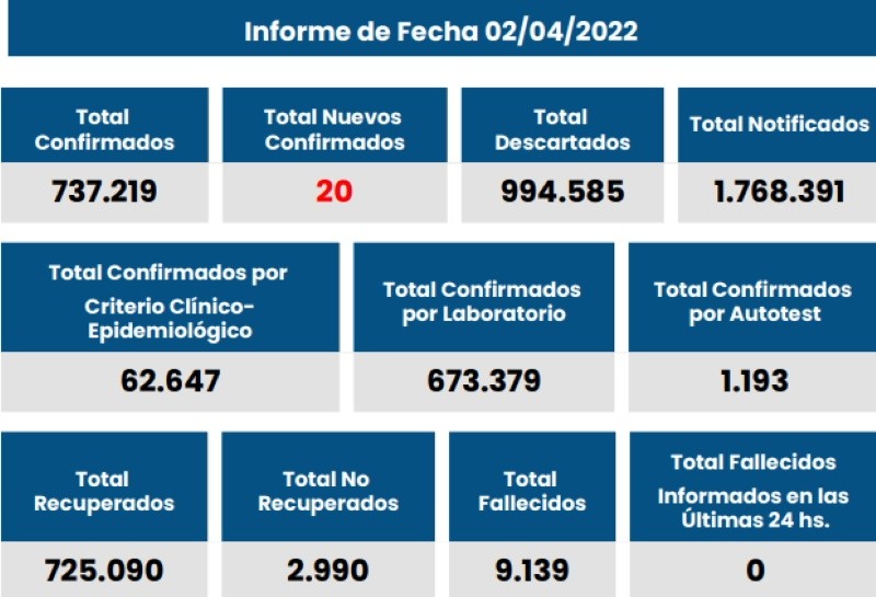 El total de positivos informados se elevó a 737.219 y los casos no recuperados o activos son 2.990.