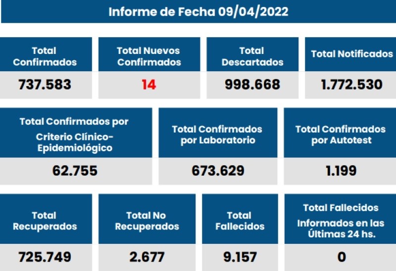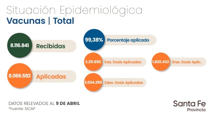 Además, el parte del Ministerio de Salud no notificó fallecidos por covid y el número total de víctimas desde el inicio de la pandemia se mantiene en 9.157 en Santa Fe.