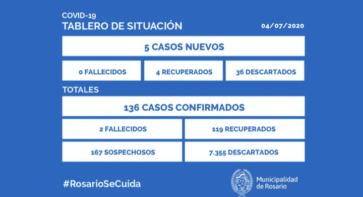 La cifra de enfermos con covid-19 en Rosario asciende a 136 y por otro lado se sumaron cuatro recuperados en esta jornada (119 en total), adelantaron fuentes sanitarias.