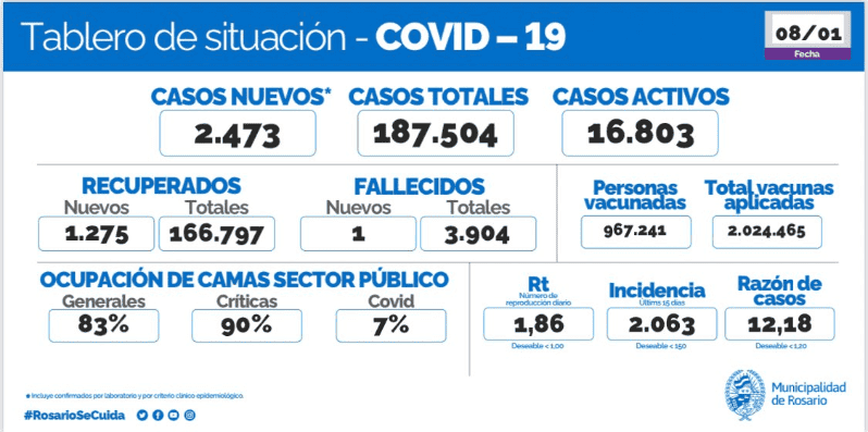 Con ese registro, Rosario suma 187.504 infectados en estos casi dos años de crisis sanitaria por el covid-19. De ellos, 16.803 son pacientes activos.