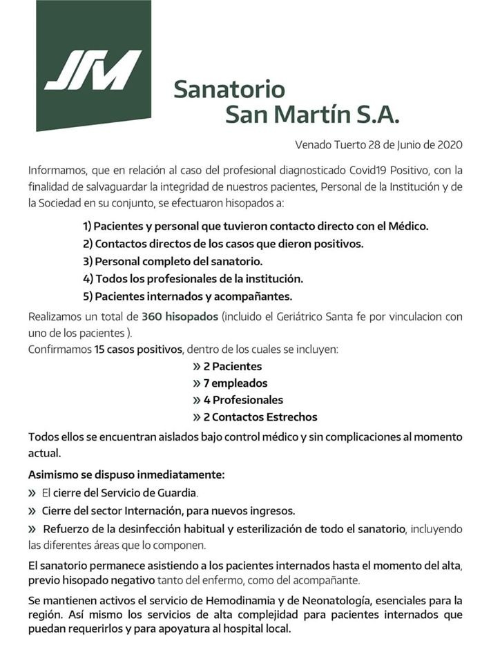 "Informamos, que en relación al caso del profesional diagnosticado covid-19 positivo, con la finalidad de salvaguardar la integridad de nuestros pacientes, personal de la institución y de la sociedad en su conjunto, se efectuaron hisopados a: pacientes y personal que tuvieron contacto directo con el médico; contactos directos de los casos que dieron positivos; personal completo del sanatorio; todos los profesionales de la institución; pacientes internados y acompañantes", señaló el comunicado del sanatorio San Martín.
