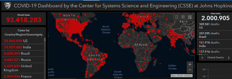 Según la JHU, que monitorea el desarrollo de la pandemia, durante las últimas 24 horas se reportaron 733.459 casos y 14.962 fallecidos a nivel mundial, lo que sitúa los totales en 93.158.547 y 1.995.273, respectivamente.