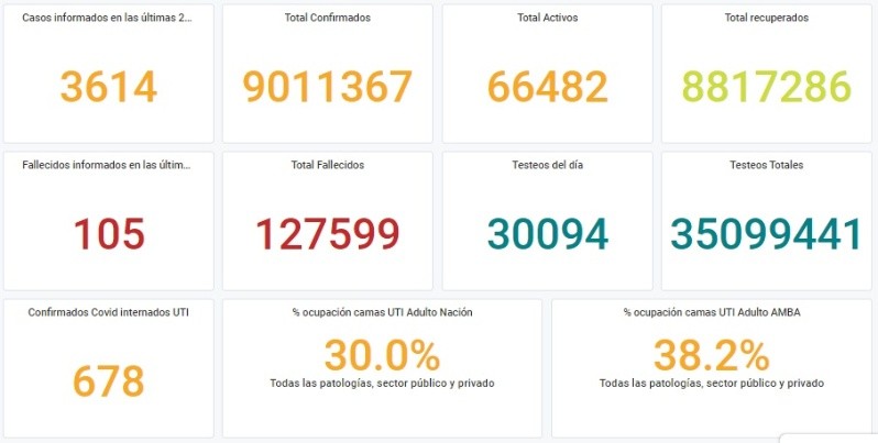 De esta manera, ya suman 127.599 los fallecidos registrados oficialmente a nivel nacional y 9.011.367 los contagiados desde el inicio de la pandemia.