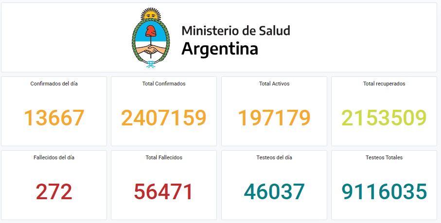 El Ministerio de Salud de la Nación informó este lunes 13.667 nuevos casos de coronavirus y 272 muertes en las últimas 24 horas en el país.