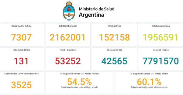 El Ministerio de Salud de la Nación informó este martes 7.307 nuevos casos de coronavirus en Argentina y 131 muertes notificadas. Con estos números, el total de contagios en el país desde el inicio de la pandemia llegó a los 2.162.001 y las víctimas fatales a 53.252.