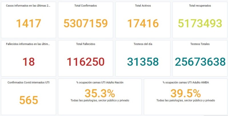 Otras 18 personas murieron y 1.417 fueron reportadas con coronavirus en las últimas 24 horas en la Argentina, con lo que suman 116.250 los fallecidos registrados oficialmente a nivel nacional y 5.307.159 los contagiados desde el inicio de la pandemia, informó este lunes el Ministerio de Salud de la Nación.