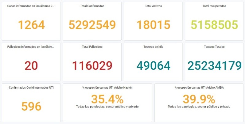 La cartera sanitaria indicó que son 596 los internados con coronavirus en unidades de terapia intensiva, con un porcentaje de ocupación de camas de adultos de 35,4% en el país y del 39,9% en el Área Metropolitana Buenos Aires.