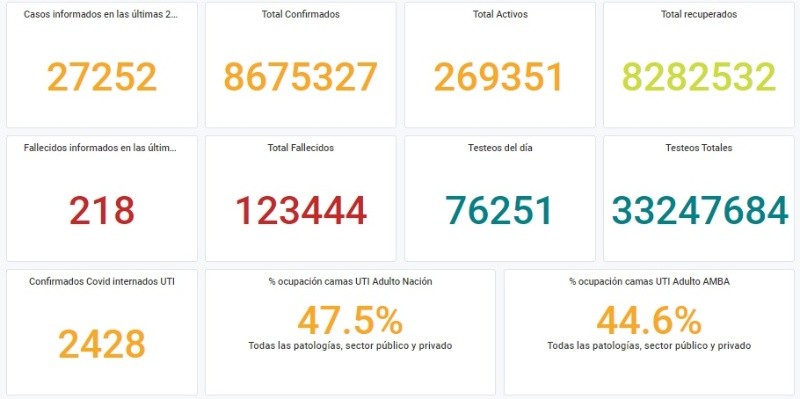 De esta manera, ya suman 123.444 los fallecidos registrados oficialmente a nivel nacional y 8.675.327 los contagiados desde el inicio de la pandemia.