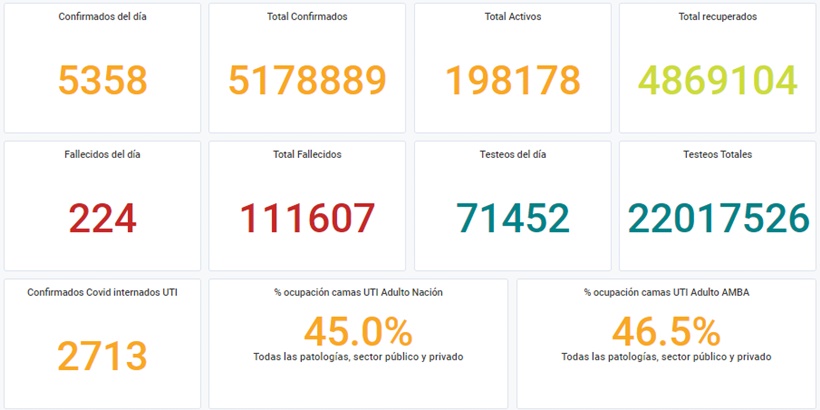 Otras 224 personas murieron y 5.358 fueron reportadas con coronavirus en las últimas 24 horas en la Argentina, con lo que suman 111.607 los fallecidos registrados oficialmente a nivel nacional y 5.178.889 los contagiados desde el inicio de la pandemia, informó este lunes el Ministerio de Salud.