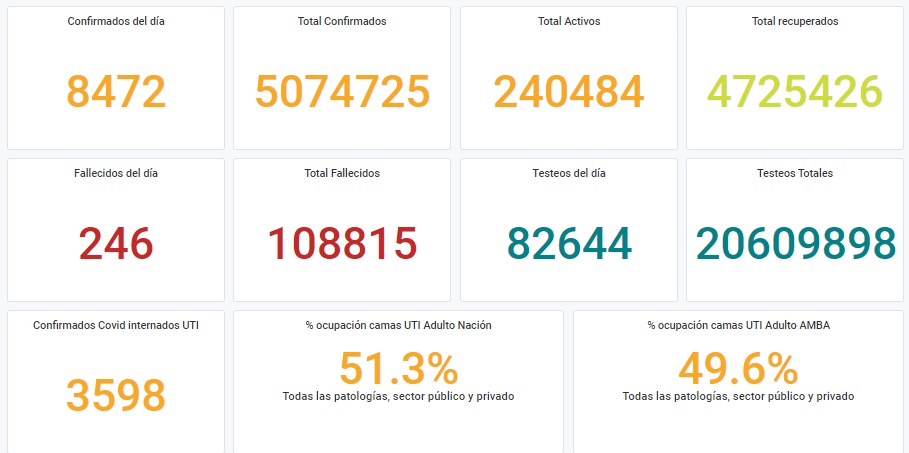 Otras 246 personas murieron y 8.472 fueron reportadas con coronavirus en las últimas 24 horas en la Argentina, informó oficialmente este viernes el Ministerio de Salud de la Nación.