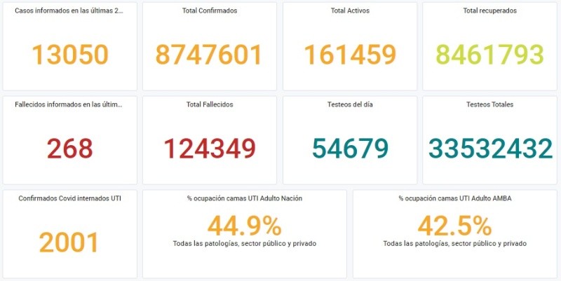 La cartera sanitaria detalló que ya suman 124.349 los fallecidos registrados oficialmente a nivel nacional y 8.747.601 los contagiados desde el inicio de la pandemia.