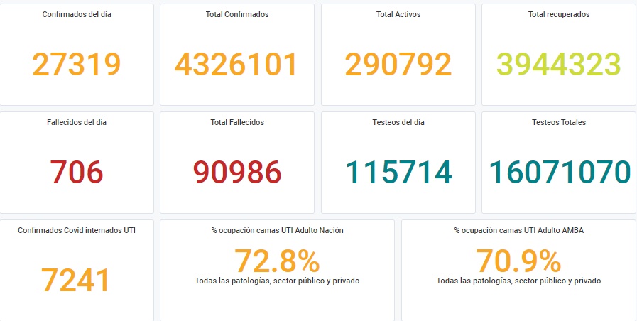 Otras 706 personas murieron y 27.319 fueron reportadas con coronavirus en las últimas 24 horas en la Argentina.