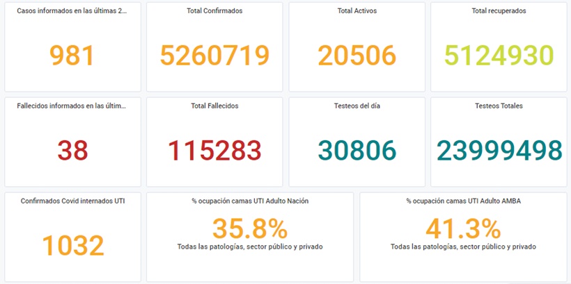 El Ministerio indicó además que se realizaron en las últimas 24 horas 30.806 testeos y desde el inicio del brote ascienden a 23.999.498 las pruebas diagnósticas para esta enfermedad.