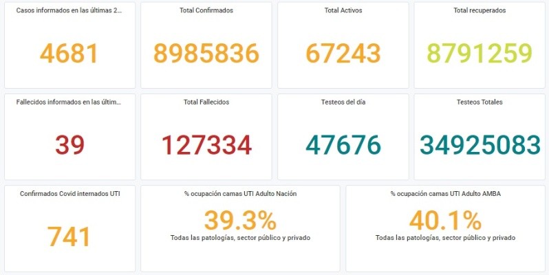 Otras 39 personas murieron y 4.681 fueron reportadas con coronavirus en las últimas 24 horas en la Argentina, con lo que suman 127.334 los fallecidos registrados oficialmente a nivel nacional y 8.985.836 los contagiados desde el inicio de la pandemia, informó este miércoles el Ministerio de Salud de la Nación.