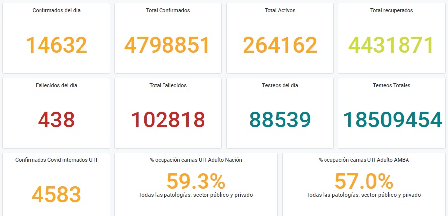 Otras 438 personas murieron y 14.632 fueron reportadas con coronavirus en las últimas 24 horas en la Argentina.
