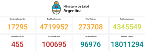 El Ministerio de Salud de la Nación informó este jueves 17.295 nuevos casos de coronavirus y 455 muertes notificadas en las últimas 24 horas. De esta manera, el total de personas que contrajeron la enfermedad desde el inicio de la pandemia llegó a 4.719.952 y las víctimas fatales a 100.695.