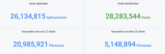 Con respecto al Plan Nacional de Vacunación, a la fecha ya se aplicaron 26.134.815 vacunas contra el coronavirus. De ese total, 20.985.921 son personas que recibieron una dosis y 5.148.894 completaron el esquema de inmunización.