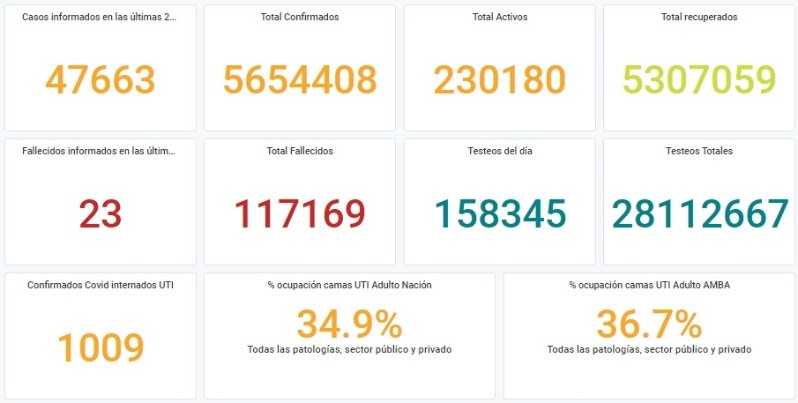 Argentina reportó este viernes 31 de diciembre 23 nuevos decesos y 47.663 casos positivos de coronavirus, informó el Ministerio de Salud de la Nación.