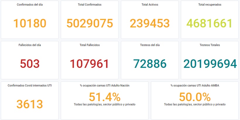 Otras 503 personas murieron y 10.180 fueron reportadas con coronavirus en las últimas 24 horas en la Argentina.