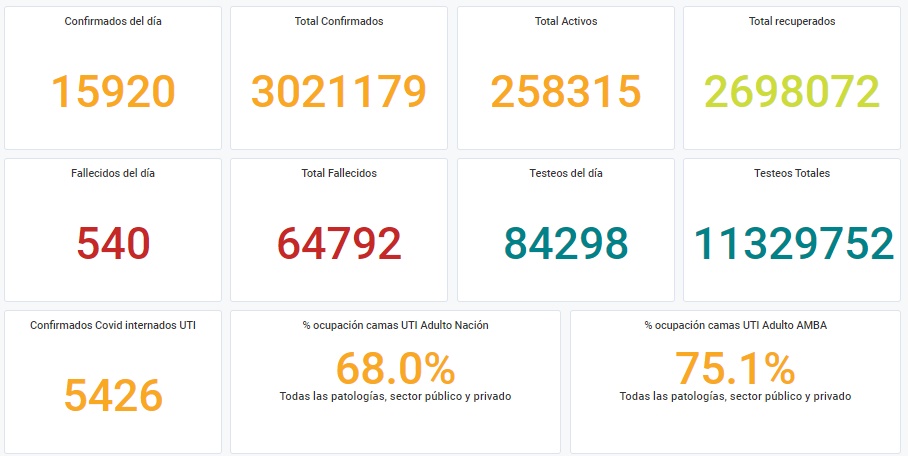 Otras 540 personas murieron y 15.920 fueron reportadas con coronavirus en las últimas 24 horas en la Argentina