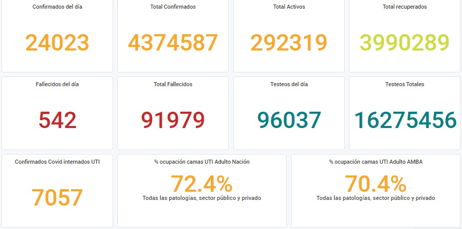Otras 542 personas murieron y 24.023 fueron reportadas con coronavirus en las últimas 24 horas en la Argentina.