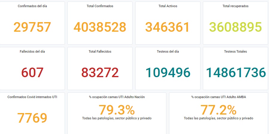 Otras 607 personas murieron y 29.757 fueron reportadas con coronavirus en las últimas 24 horas en la Argentina.