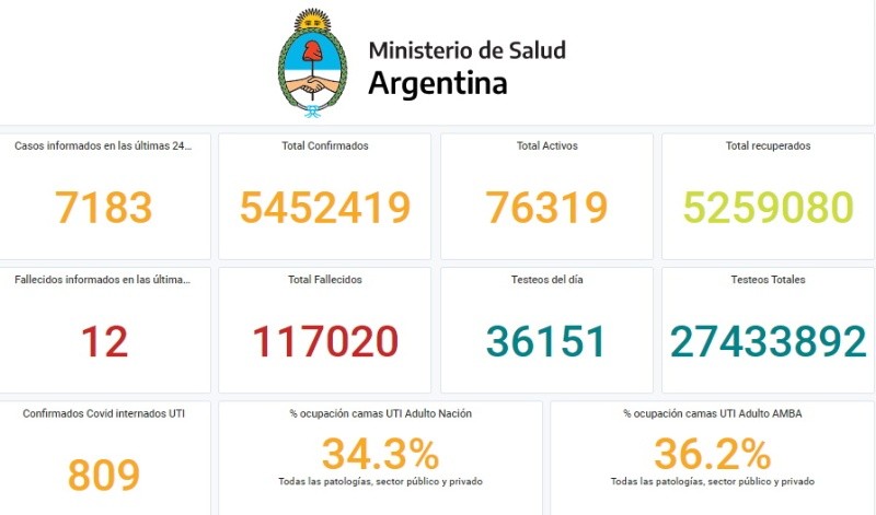Argentina sumó este sábado 7.183 nuevos casos de coronavirus y 12 muertes en las últimas 24 horas, según informó el Ministerio de Salud de la Nación en su parte sanitario diario.