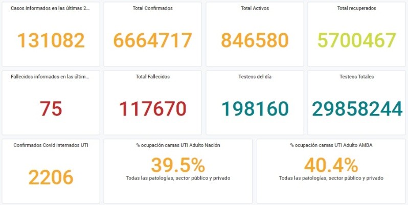 Otras 75 personas murieron y 131.082 fueron reportadas con coronavirus en las últimas 24 horas en la Argentina, según informó este miércoles el Ministerio de Salud de la Nación.