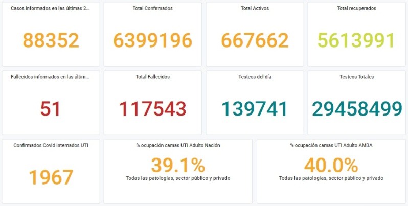 Otras 51 personas murieron y 88.352 fueron reportadas con coronavirus en las últimas 24 horas en la Argentina, con lo que suman 117.543 los fallecidos registrados oficialmente a nivel nacional y 6.399.196 los contagiados desde el inicio de la pandemia, informó este lunes el Ministerio de Salud de la Nación.