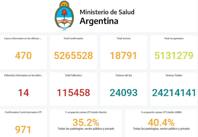 Argentina sumó este sábado 470 nuevos casos de coronavirus, el total nacional de positivos se elevó a 5.265.528, y 14 fallecidos.