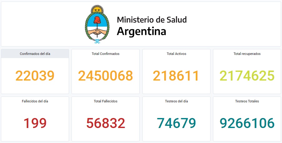 El gobierno nacional informó este miércoles otro récord de casos de coronavirus en el país: se registraron 22.039 nuevos contagios, la cifra más alta desde el inicio de la pandemia el año pasado.