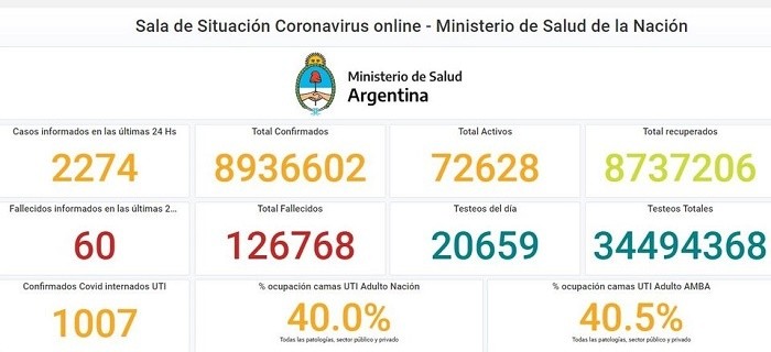 La cartera sanitaria indicó que son 1.007 los internados con coronavirus en unidades de terapia intensiva, con un porcentaje de ocupación de camas de adultos en el sector público y privado, para todas las patologías, de 40% en el país y de 40,5% en el Área Metropolitana de Buenos Aires.