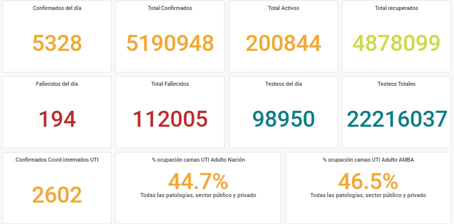 Otras 194 personas murieron y 5.328 fueron reportadas con coronavirus en las últimas 24 horas en la Argentina, con lo que suman 112.005 los fallecidos registrados oficialmente a nivel nacional y 5.190.948 los contagiados desde el inicio de la pandemia, informó este miércoles el Ministerio de Salud.