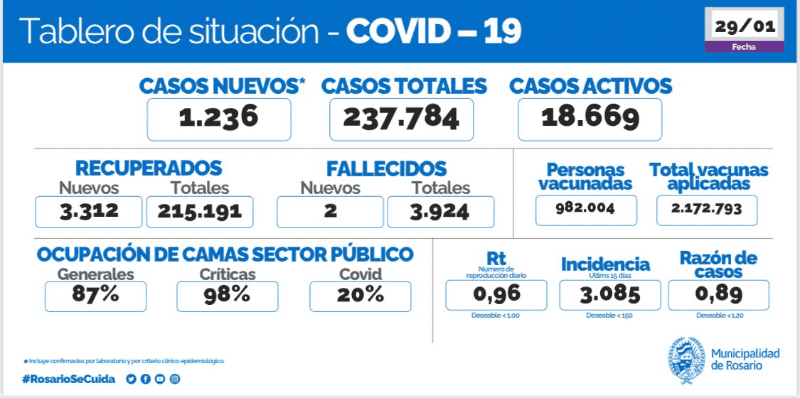Por otro lado, la ocupación de camas críticas en el sector público se mantiene en 98%, con un 20% de pacientes covid, informó la Munucipalidad de Rosario.