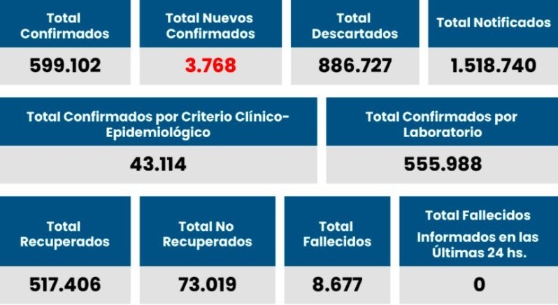 En Santa Fe son 599.102 los contagios confirmados hasta ahora y los fallecidos, 8.677, según las cifras oficiales del Ministerio de Salud.